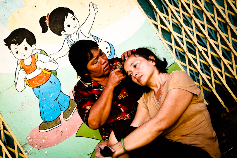 These two ladies were sitting together outside a kindergarten, checking each other’s hair for lice, a common sight in Vietnam, where people live much of their lives out of doors. Everyday intimacies like this are a feature of life on the streets here.