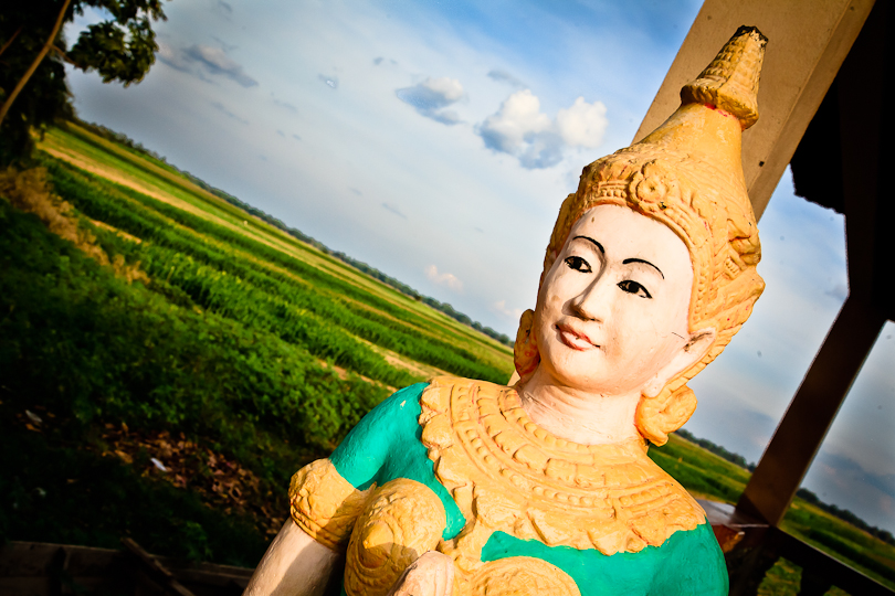 Making a rare foray into the realms of physical exercise, I cycled across Kompong Cham’s bamboo bridge (more of which later) onto Koh Paen, a small island in the Mekong river. Countless small children called “hello!” as I rattled inelegantly past stilt houses and rice fields in the late afternoon sun. Many of the rice fields in this part of Cambodia are overlooked by small, open pagodas, as in the picture above.