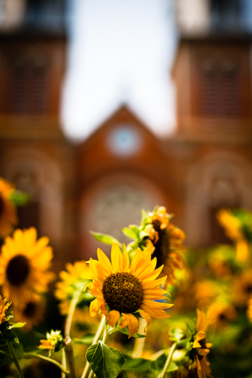 Sunflowers in front of Notre Dame cathedral in central Saigon.