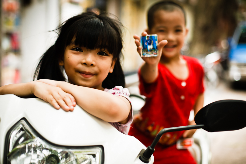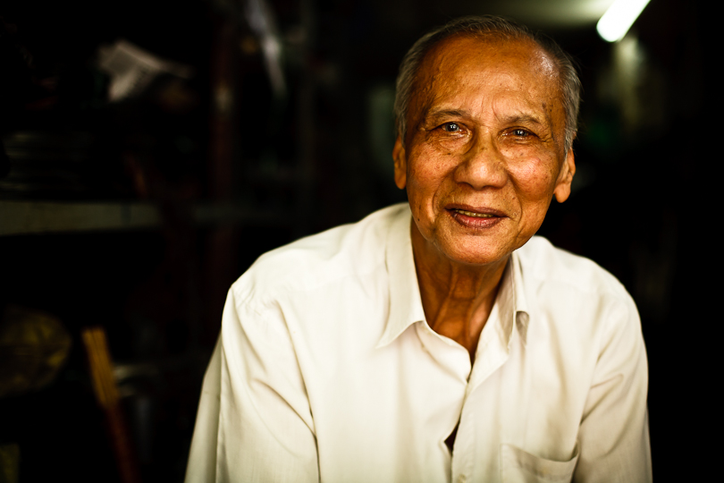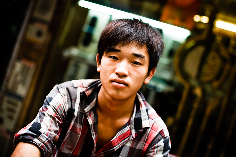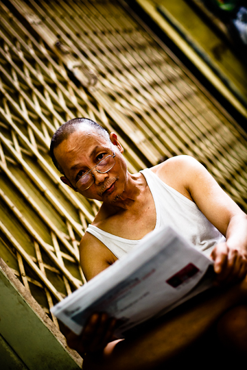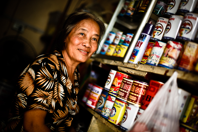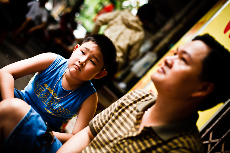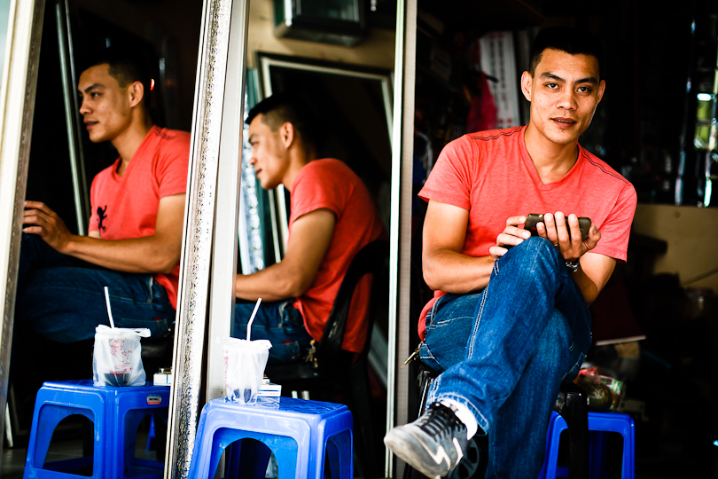 I was in Hanoi the weekend before last for a friend’s wedding.  It was a busy few days, but I found time on Sunday morning to take a slow walk down Hang Thiec, the street in the Old Quarter where household goods of tin and glass are made and sold.  The resulting clanging, crashing and buzzing noises weren’t great for my post-wedding hangover, but the hazy sunshine provided great light for people pictures.
