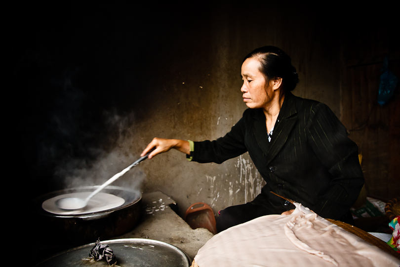 She was making rice noodles in a tiny street-side kitchen in the late afternoon. I liked the way she was lit by the fading sunlight outside, and I liked her style. Her slightly incongruous black suit jacket made a great contrast to the bright colours worn by the Flower Hmong market traders elsewhere in town.